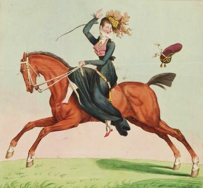 Few women rode in a fox hunt during the Regency period. It took great skill and courage for a woman to join the hunt, for in those days the side-saddle lacked the leaping horn, which offered a more secure seat and made taking fences safer.