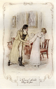 In Emma, “Harriet certainly was not clever, but she had a sweet, docile, grateful disposition.” All Harriet’s loves are all based on gratitude. First, she is grateful to Robert Martin, who got her walnuts and brought in the shepherd’s son to sing for her. Then she is attracted to Mr. Elton, because Emma says he is attracted to her. Her next love is Mr. Knightley, who rescues her at the dance. She thinks of him with “gratitude, wonder, and veneration.” Of course, Emma thinks Harriet has fallen in love with Frank Churchill, out of gratitude to him for rescuing her from the gypsies. Then when Robert Martin proposes again, Harriet is so grateful that she immediately says yes, not waiting for anyone to dissuade her this time!