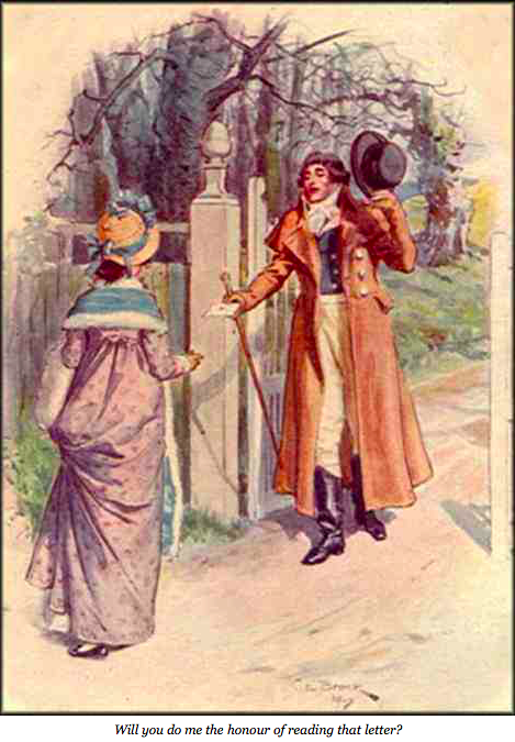 Of course, she soon changes her mind. After she reads his letter, we find that,  “his attachment excited gratitude, his general character respect.” What a switch!