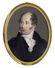 Balding men benefited from the close cropped, forward brushed styles. c.1815. Louis Francois Aubry. Monsieur Rivio Baritone in Paris Opera. Image courtesy of A Private Portrait Miniature Collection. (Update:) Mr. Phillips, who oversees the blog, lists the date of the portrait as 1840.
