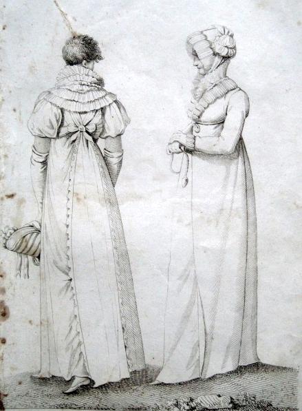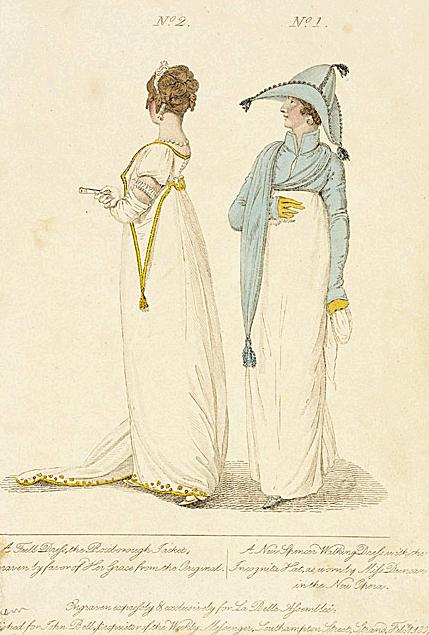 Not all fashion plates were created equal. La Belle Assemblée came out in two forms, one at half-a-crown with plain fashion-plate and one at three shillings and sixpence with the plates coloured by hand. * The difference in treatment can be seen in the fashion plates below.