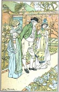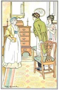 Mrs Morland was struck by General Tilney’s actions of sending her away without even a servant to escort her, and the needless trouble he caused her daughter. Not only could travel be dangerous during this era, especially at night when highwaymen roamed (recall the earlier Hugh Thomson image), or in the bitter cold of winter, but the journey might be delayed due to a broken wagon wheel, a lame horse, or impassable roads, rivers, or streams. Mrs Morland, ever the positive thinker, concludes that this experience was a character builder for her daughter.