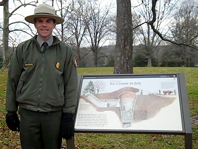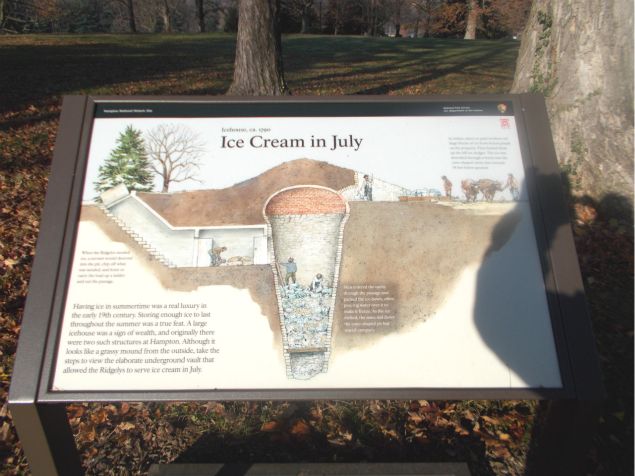 In winter, slaves or paid workers cut large blocks of ice from frozen ponds on the property. They handed them up the hill on sledges. The ice was shovelled through a hatch into the cone-shaped cavity that extends 34 feet below ground.” – Text, National Park Service