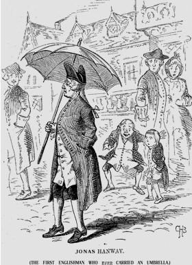 Yet the following passage from Notes and queries, Volume 54, William White (Oxford University Press, 1876,  p. 202), suggests that men began to use umbrellas earlier than Jonas Hanway, who braved ridicule from street urchins and hackney coachmen, who regarded the use of the umbrella as a threat to their livelihood: