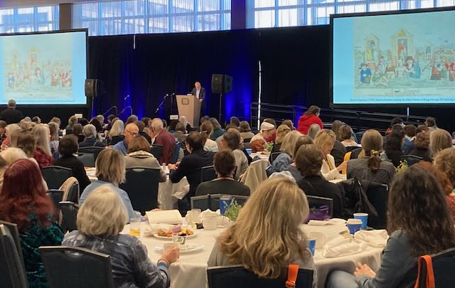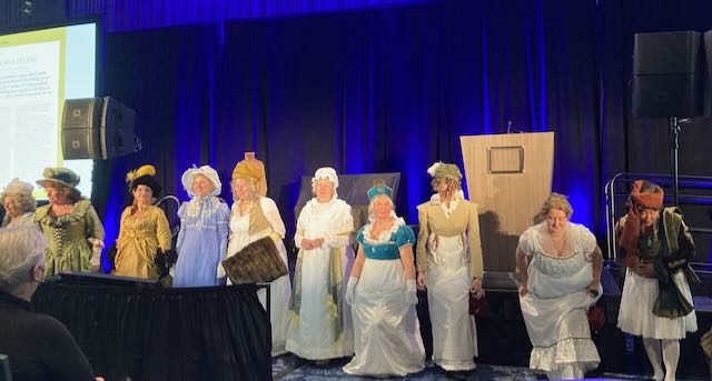 On Oct. 16-20 of this year, 660 JASNA members attended the AGM in person, including 30 students, plus 63 companions and 160 virtual participants. 20% were first-time participants. About 90% were women, about 10% men. The topic was “Austen, Annotated: Jane Austen’s Literary, Political, and Cultural Origins.” A wide area. But right up our alley here at “Jane Austen’s World.” This conference touched on many areas of the context of Austen’s life and writings, which gave participants new insights into her novels.