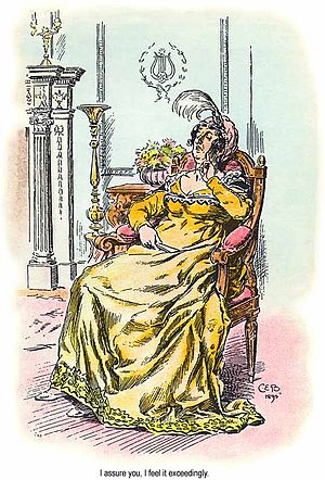 This effusive praise begs the question: if Lady CdeB had a lick of sense, why would she waste her precious time with this clown? Austen continues to dangle interesting glimpses of her in front of us, using Mr. Collins as her mouthpiece and building up our expectations of this nonpareil. During the most brilliantly ridiculous proposal written in English literature, Austen arranges to have Lady CdeB speak directly to us for the first time: