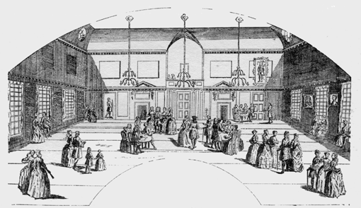 The ball-room was used during the daytime as a promenade, for which it was well suited from its size and pleasant situation; its windows commanding extensive views of the Avon winding amidst green meadows and flanked by wooded hills. The accompanying reproduction of an old print taken from a design for a fan, shows the ball-room when used for this purpose. It was the fashion also for the company to invite each other to partake of breakfast at the Lower Rooms after taking their early baths or first glass of water.