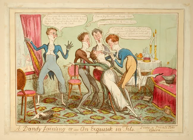 Tight trousers create a dilemma for this dandy, who cannot pick up his handkerchief. Notice the very high waist.