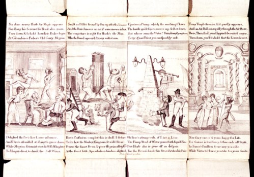 Below is a very rare example from the V&A shows a souvenir from a play first performed at the Theatre Royal, Covent Garden in 1800 called Harlequin’s Tour or the Dominion of Fancy. While the souvenir survives, the dialogue for the play does not.