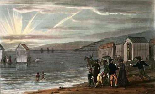 Regardless of their location in or out of the water, non-swimmers remained covered up. It is ironic that once in the water, so many men and women would swim completely naked, but there you have it: Seaside, Regency style.