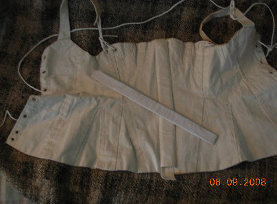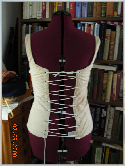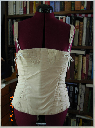 Until now I have not discussed the role that corsets played in propping up the bust line. Regency stays, which were darted and laced in the back, were quite short and were much less constricting than earlier Georgian models that cinched in the waist. The purpose of the Regency stay was to support a woman’s bust and create the distinctive Regency “shelf” silhouette.