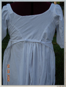 In the image painted by Cassandra, Jane wears a simple gown, much like the Binney sisters were wearing. You can observe her chemisette under the low neckline, which created a more modest look for day time.