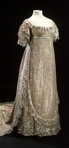 Her dress was silver lama [lamé] on net, over a silver tissue slip, embroidered at the bottom with silver lama in shells and flowers. Body and sleeves to correspond, elegantly trimmed with point Brussels lace. The manteau was of silver tissue lined with white satin, with a border of embroidery to answer that on the dress, and fastened in front with a splendid diamond ornament. Such was the bridal dress … La Belle Assemblee, May 1816