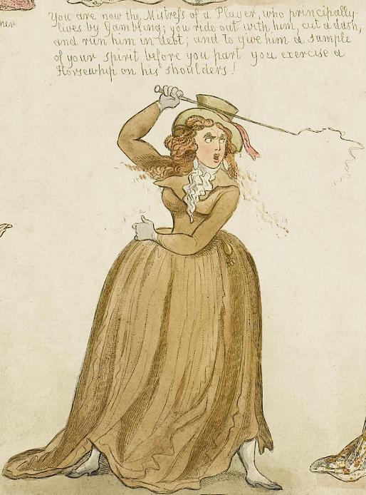 You are now the mistress of a Player, who principally lives by Gambling; you ride out with him, cut a dash, and run him in debt; and to give him a sample of your spirit before you part you exercise a Horsewhip on his shoulders.