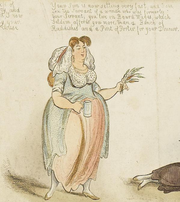 Your sun is now setting very fast, and I see you the servant of a woman who was formerly your Servant, you live on Board Wages, which seldom affords you more than a Bunch of Radishes and a Pint of Porter for your dinner.