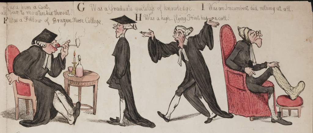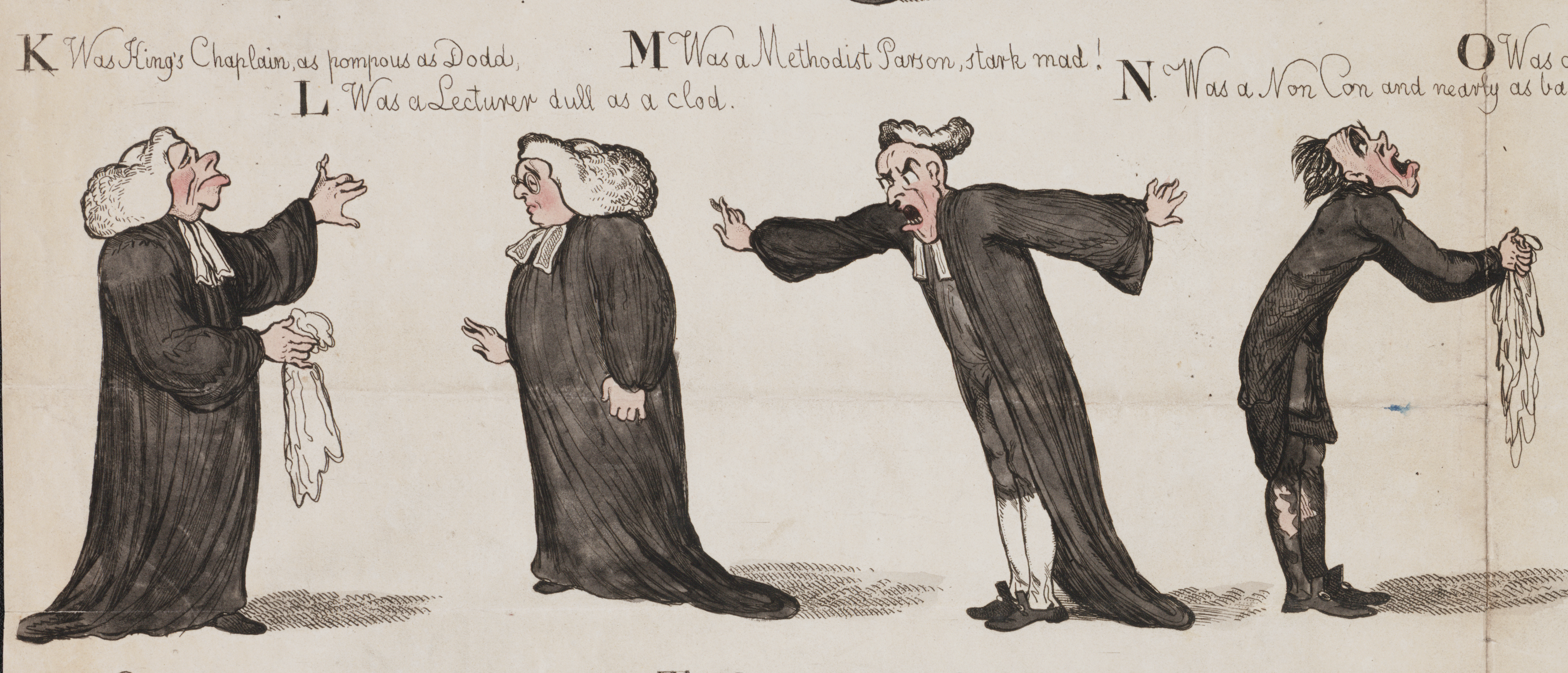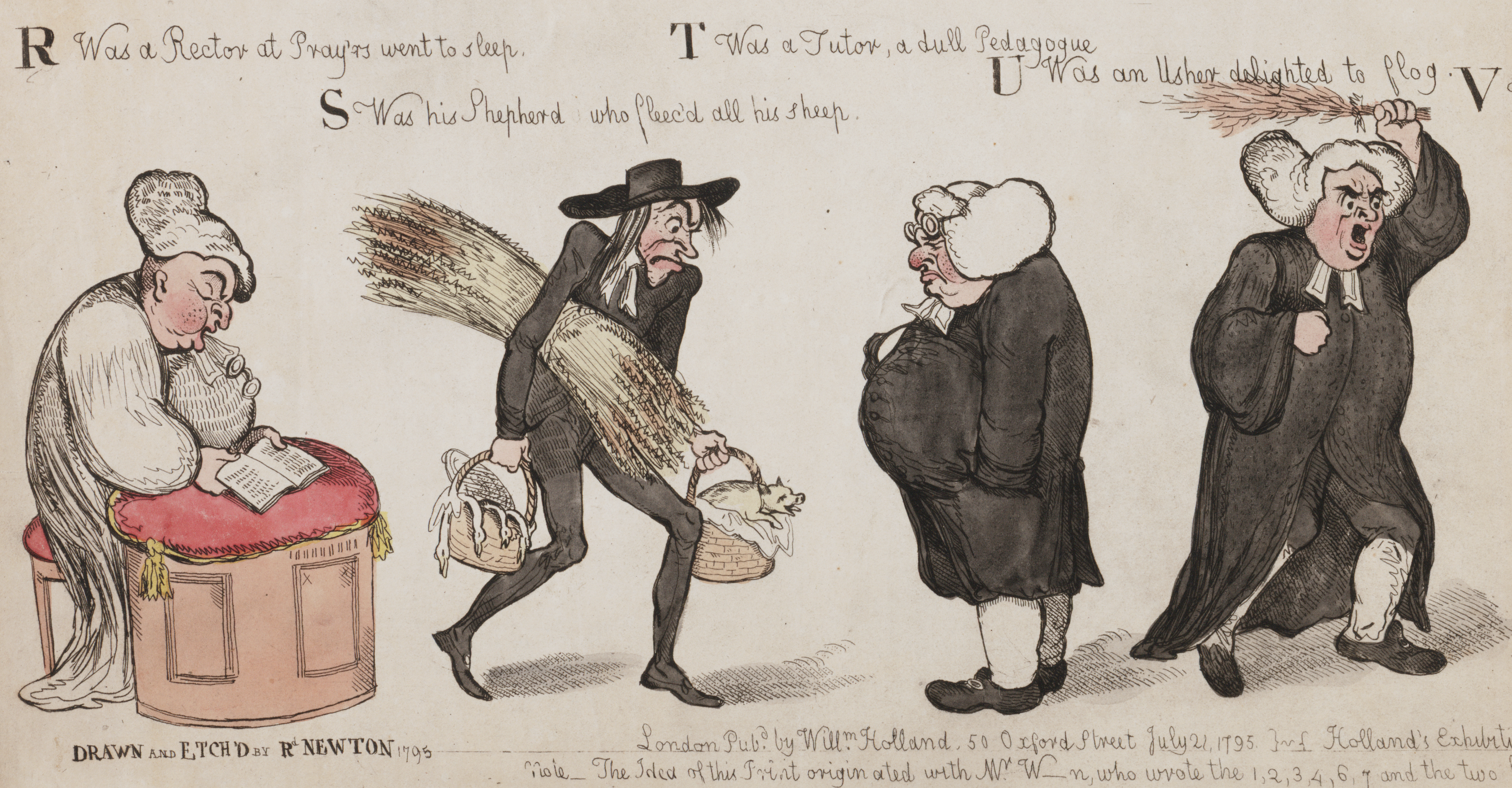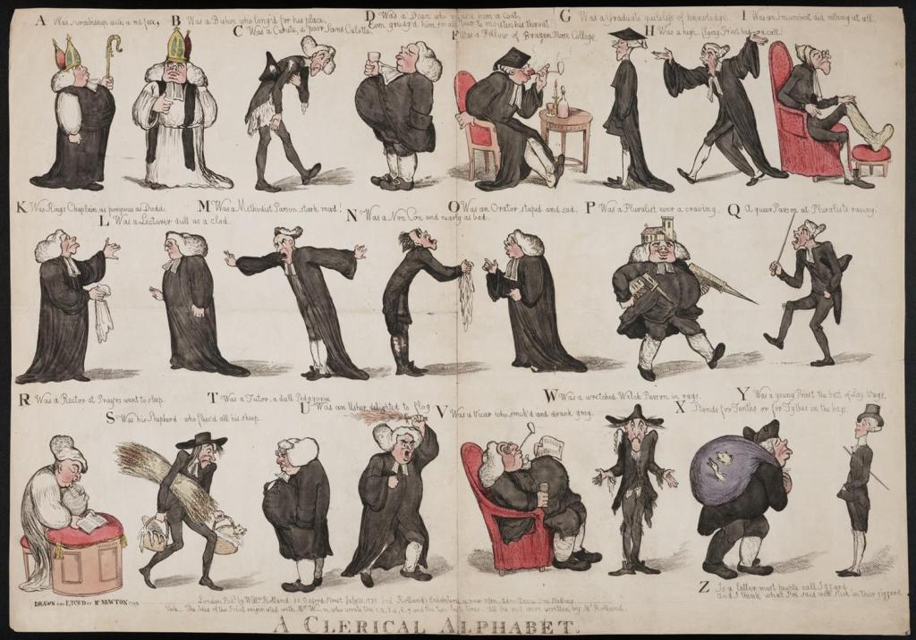 Richard Newton’s “A Clerical Alphabet,” published in 1795. Illustrations by Richard Newton; captions by Newton and publisher William Holland. Courtesy of the Lewis Walpole Library, Yale University.