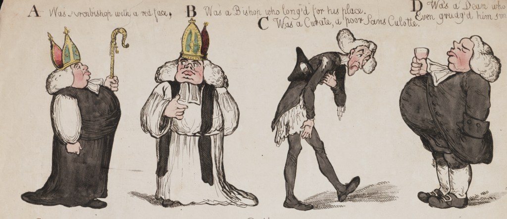 The “Clerical Alphabet” begins: A Was Archbishop with a red face, B Was a Bishop who long’d for his place. C Was a Curate, a poor Sans Culotte, D Was a Dean who refus’d him a Coat Even grudged him small beer to moisten his throat. (No picture for E, just a caption.)