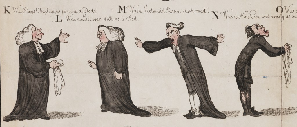 K: The king’s chaplain was the king’s personal priest for the Chapel Royal. William Dodd (1729-1777) was an extravagant clergyman who became chaplain to the King of England in 1763. To clear his debts, he forged a bond for £4200. He was convicted and hanged in 1777. L: A lecturer was a preacher chosen and paid by the congregation who gave additional sermons (“lectures”) at a church, usually at afternoon or evening services. M: The Methodists were part of the Church of England until around this time. They were known for their emotional enthusiasm and their focus on salvation by grace. Some Methodist preachers, including John Wesley, preached to large open-air meetings. According to Wesley’s Journal, listeners sometimes responded with “outcries, convulsions, visions, and trances.” More orthodox Anglicans considered this madness. When Edmund rebukes Mary Crawford, she ridicules him, saying, “when I hear of you next, it may be as a celebrated preacher in some great society of Methodists.” In the late 1700s, the Methodists separated from the Church of England and became Dissenters. N: A NonCon was a Non-Conformist or Dissenter, a person who did not “conform” to the Church of England (or “dissented” from its statement of faith). These included Catholics, who faced major prejudices in Austen’s England. Baptists, Quakers, Independents, Unitarians, and others all fell into this category. They were usually from the middle and lower classes at this time. They could not get a degree from the universities, and were not supposed to hold public office. Mainstream Anglicans thought Nonconformists were enthusiasts (excessively emotional) like the Methodists.