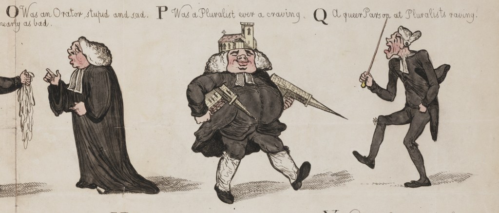 O: An orator, as today, was a public speaker. In Mansfield Park, Edmund and Henry Crawford discuss how to best read the liturgy and preach in Church of England services. They agree that it was often done poorly. Edmund says that things have changed, and now, “It is felt that distinctness and energy may have weight in recommending the most solid truths.” Edmund is concerned with communicating truth. Henry, though, would like to speak well in order to be popular and admired. P-Q: Pluralists held multiple church livings. They might live in one parish and serve as its minister and pay curates to serve the others, while they took most of the income from those parishes as well. They were not necessarily fat, though. Some livings were quite small and the clergyman needed a second one. Jane Austen’s father held two livings, at Steventon and Deane. They were close enough together that he could lead services at both churches on Sundays, and the income from each was low. Some pluralists, however, were extremely wealthy. In Mansfield Park, Sir Thomas Bertram says a clergyman should reside in his parish to set an example and care for the people of the parish. We don’t know what Edmund did once he had two parishes to care for, at Mansfield Park and Thornton Lacey.