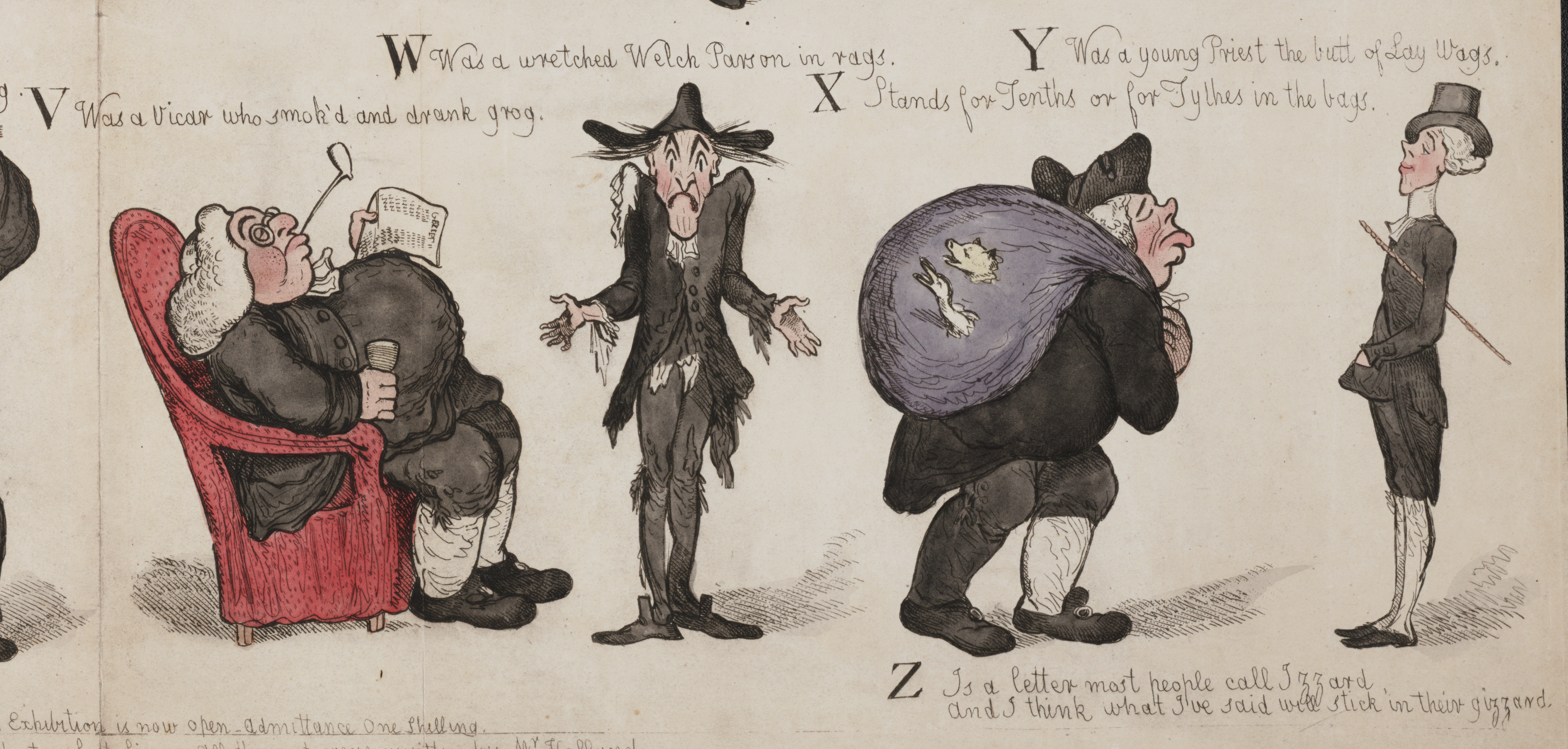 V Was a Vicar who smok’d and drank grog. W Was a wretched Welch Parson in rags. X Stands for Tenths or for Tythes in the bags. Y Was a young Priest the butt of Lay Wags. Z Is a letter most people call Izzard And I think what I’ve said will stick in their gizzard. (No picture for Z.)