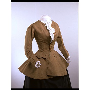 In the 18th and through most of the 19th centuries, women’s riding habits were generally made by tailors and constructed like men’s wear. They were usually buttoned left over right, like a man’s coat. Other women’s fashions were made by dress makers and mantua makers. Masculine touches onwomen’s riding habits included mariner’s cuffs and fabrics and trims as seen on naval uniforms. These riding habits were functional, but in the late 1700s they became fashionable dress as well, and were worn for informal day wear for traveling, visiting, or walking.